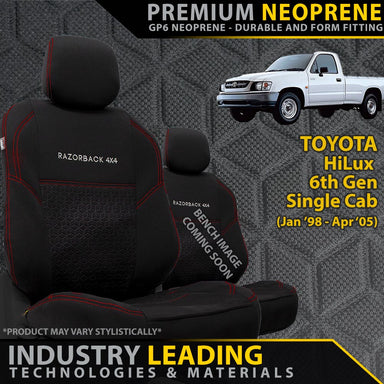 View full detailsComfortable and Durable Covers Tailor Made to Fit Your 6th Gen HiLux Single CabMade from Genuine Sakimotto Neoprene: Soft, comfortable and stylish....